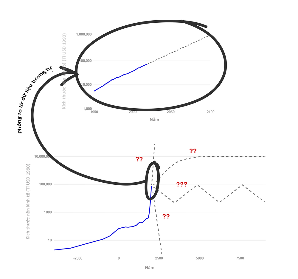 Tất cả chúng ta đều đã quen với việc tăng trưởng vài phần trăm mỗi năm. Nhưng trong bối cảnh lịch sử đầy đủ, tăng trưởng vài phần trăm mỗi năm là điều điên rồ. (Đó là đoạn đường màu xanh lam gần như thẳng đứng.)