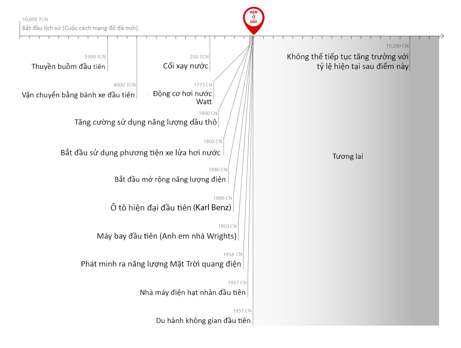 Hình 3: Trong bài viết trước, tôi đã chỉ ra rằng những sự kiện quan trọng nhất trong lịch sử dường như tập trung xung quanh thời điểm chúng ta đang sống, minh họa qua dòng thời gian này. Đó là khi nhìn vào các khung thời gian hàng tỷ năm. Nhưng nếu như phóng to đến hàng nghìn năm, chúng ta thấy điều gì đó tương tự: những tiến bộ khoa học và công nghệ lớn nhất tập trung rất gần với thời điểm hiện tại. Để minh họa điều này, dưới đây là dòng thời gian tập trung về giao thông và năng lượng (Tôi nghĩ có thể chọn bất kỳ một danh mục nào và tôi cũng sẽ được một bức tranh tương tự).