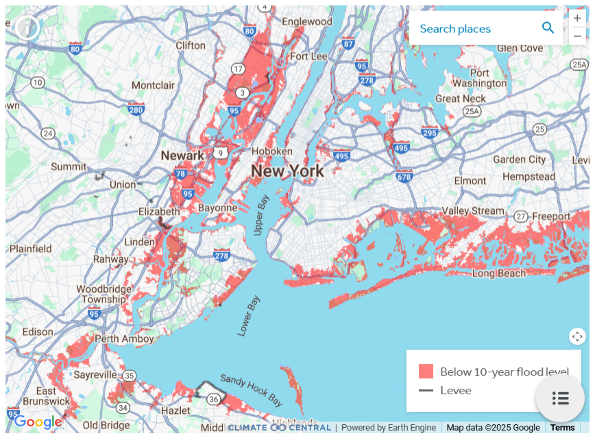 Bản đồ này minh họa những vùng đất sẽ nằm dưới mực triều cường vào năm 2100 trong kịch bản Trái Đất nóng lên 5°C.